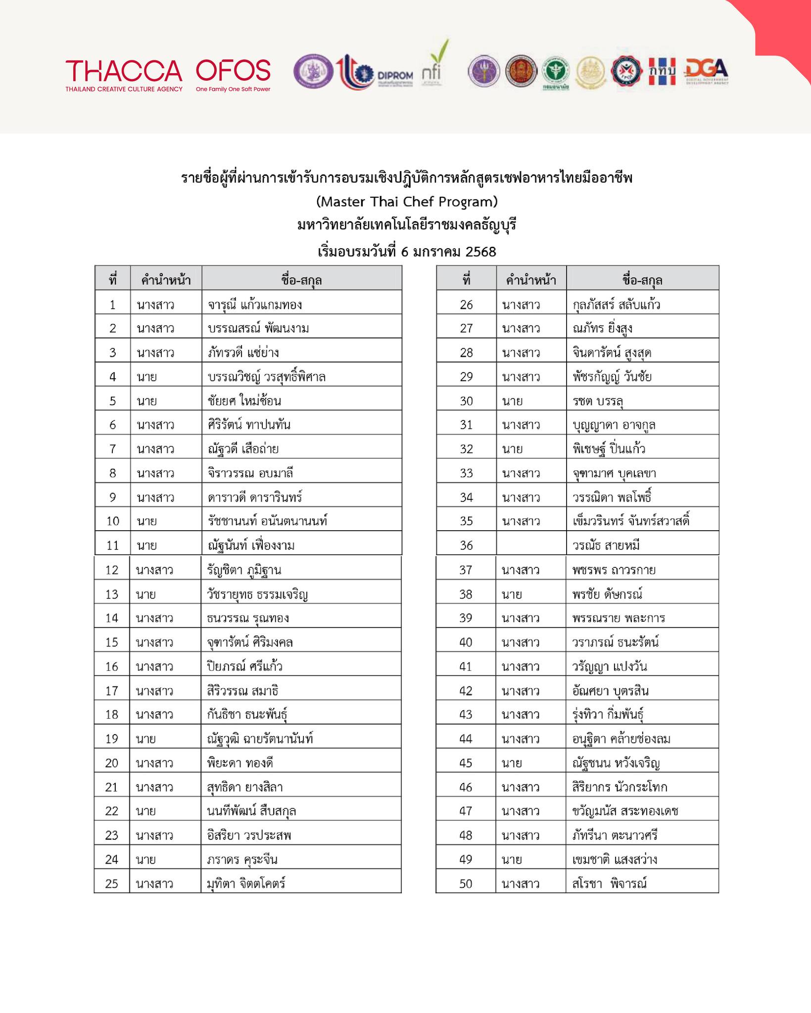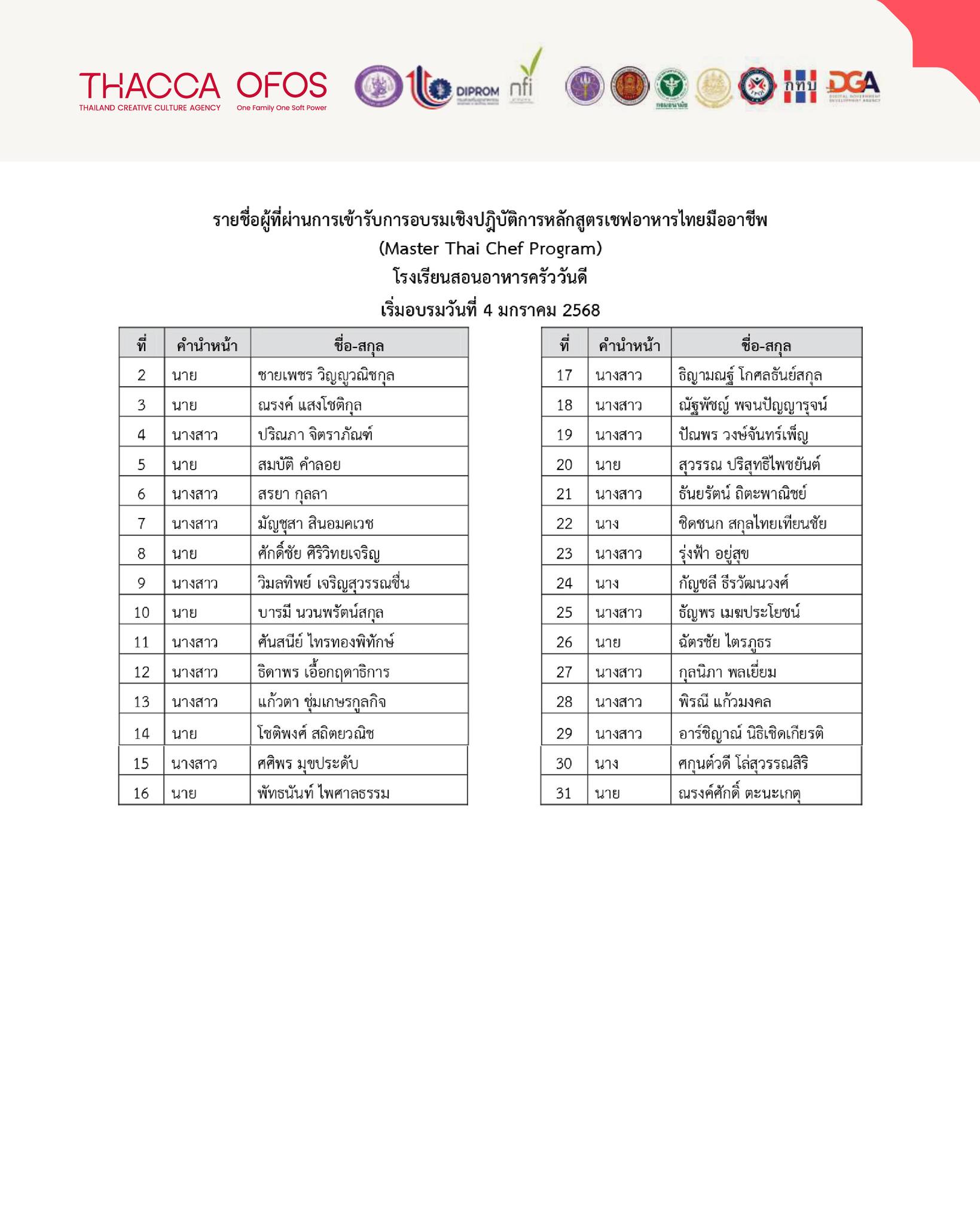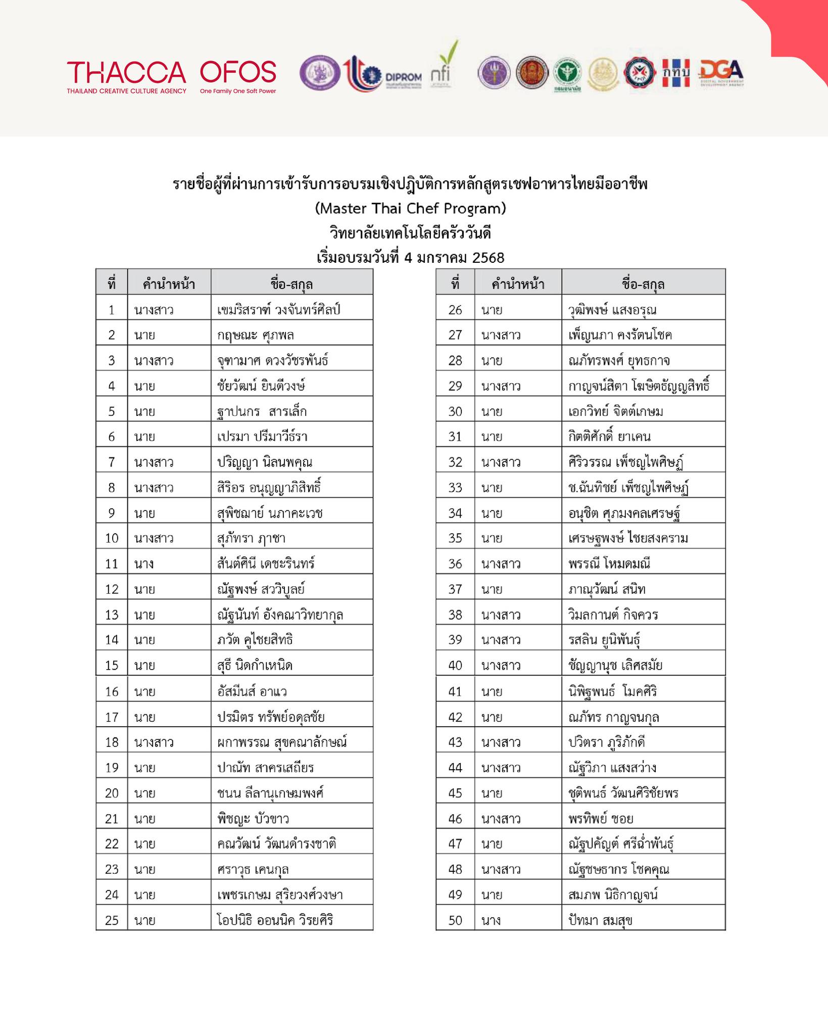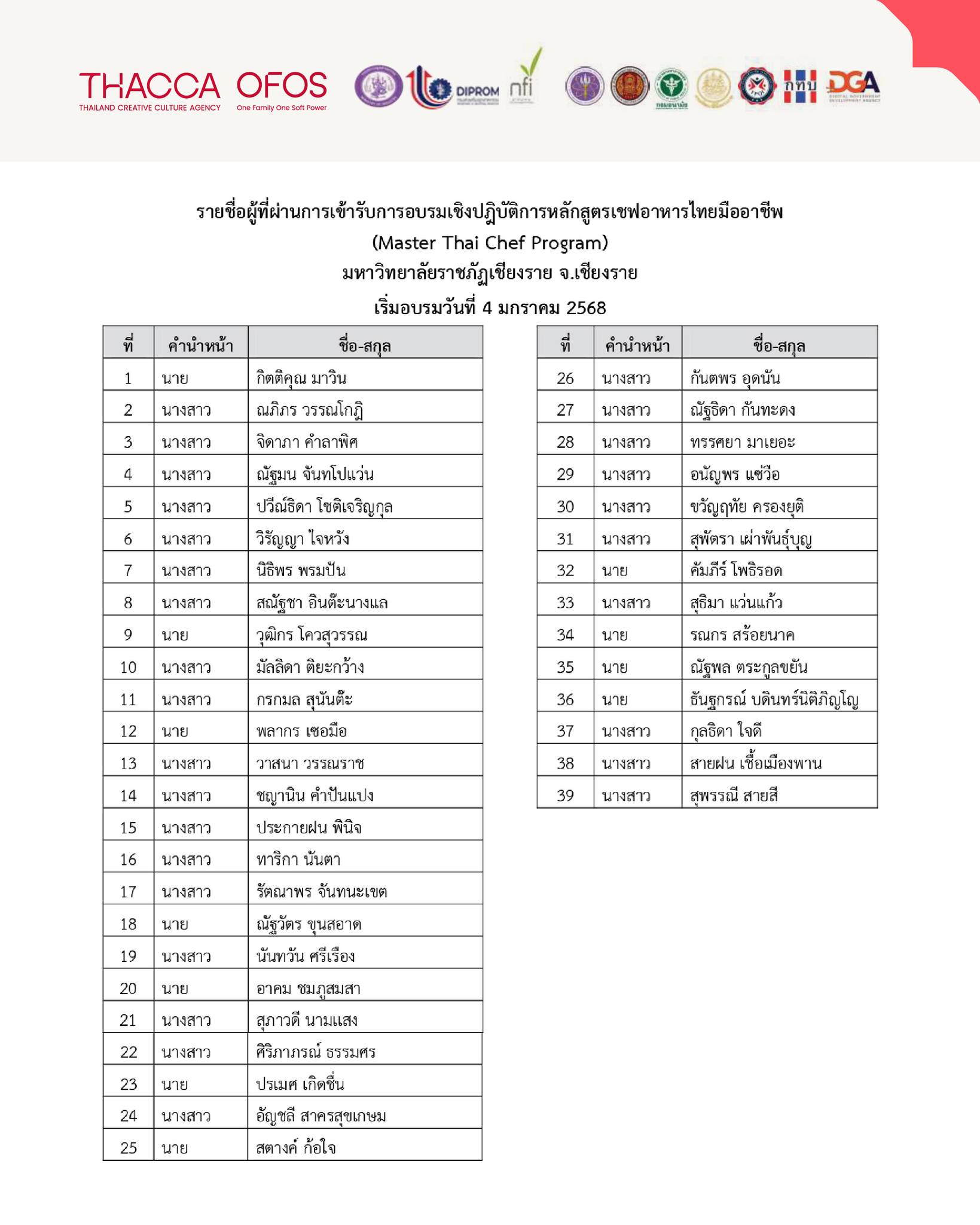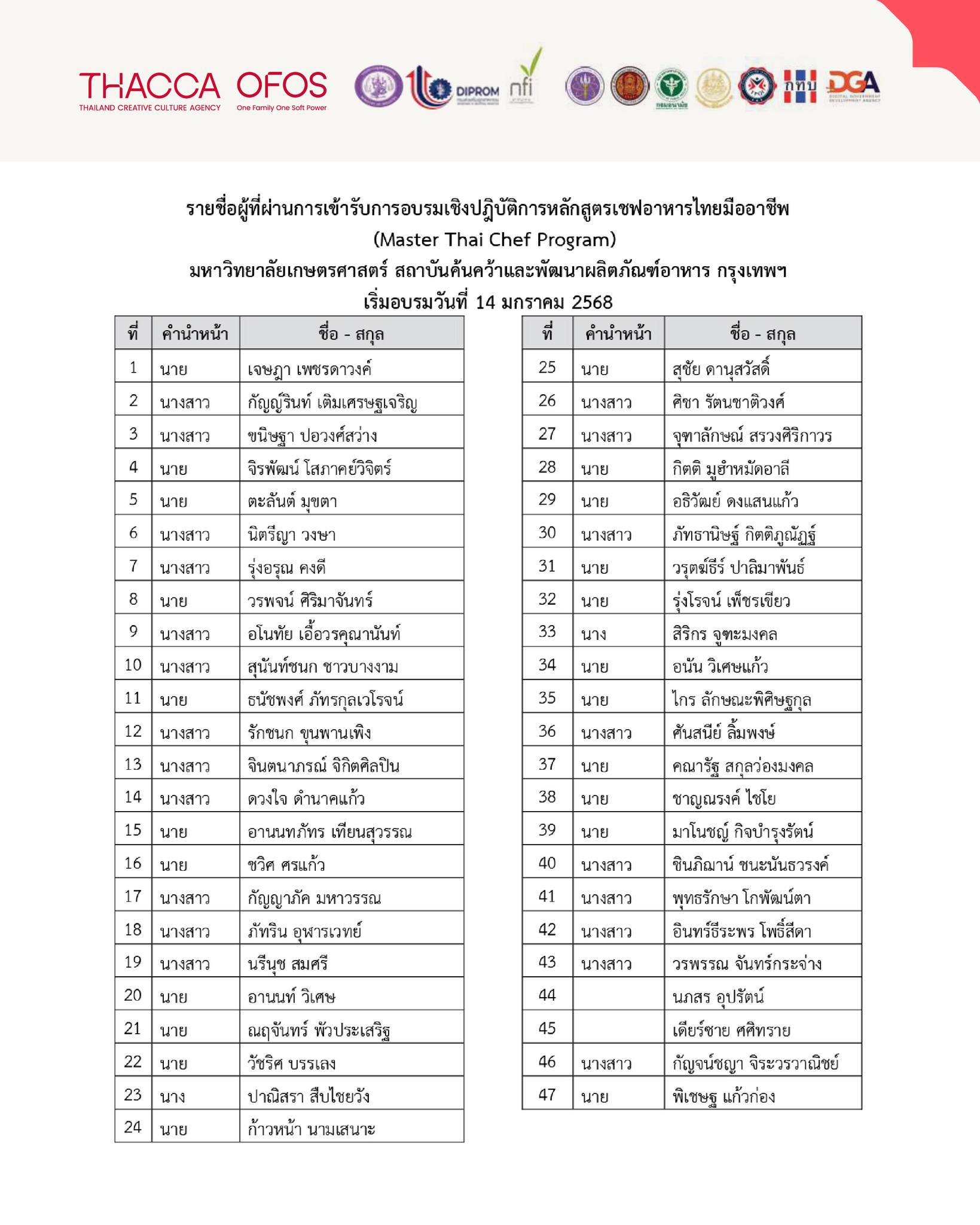 THACCA โดยคณะอนุกรรมการขับเคลื่อนอุตสาหกรรมด้านอาหาร ประกาศรายชื่อผู้ผ่านการคัดเลือกเข้าร่วมอบรมในโครงการ “หนึ่งหมู่บ้าน หนึ่งเชฟอาหารไทย” รุ่นที่ 1