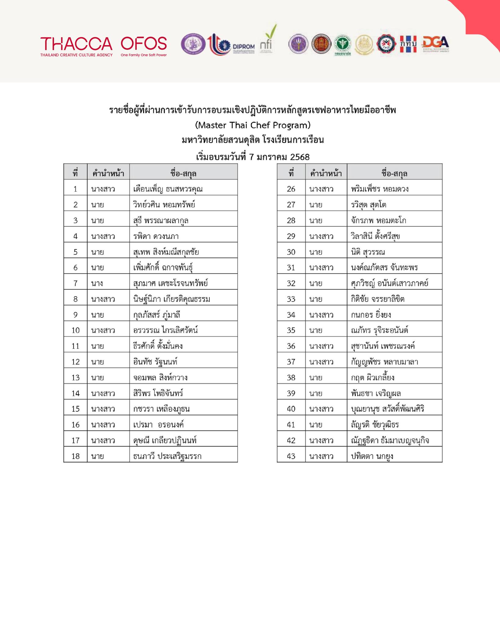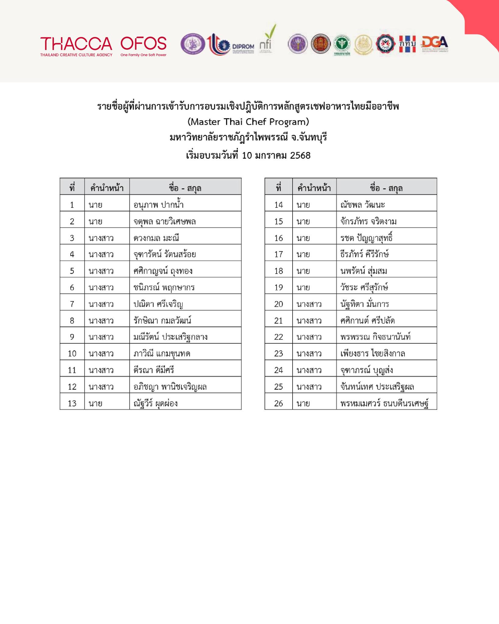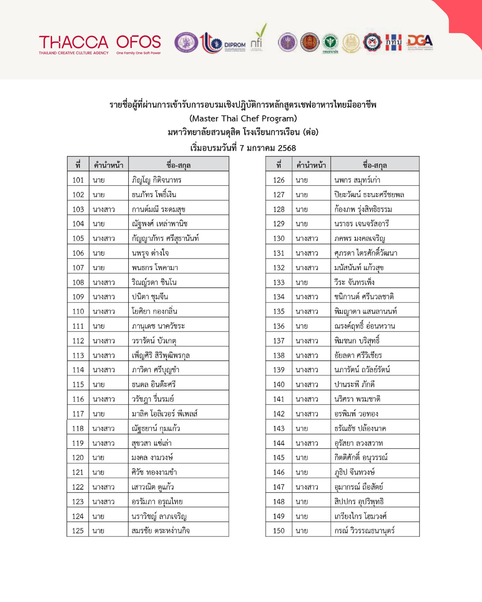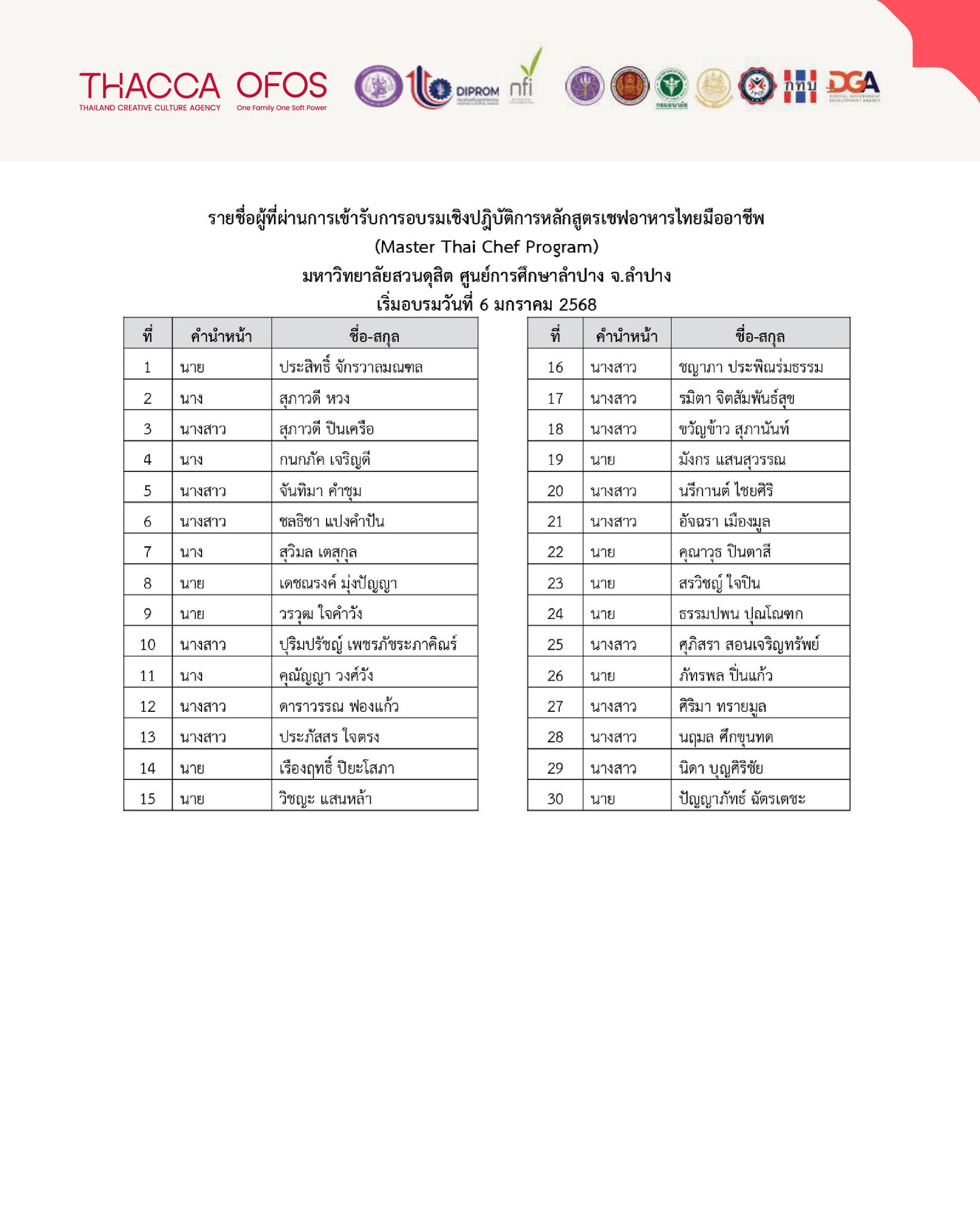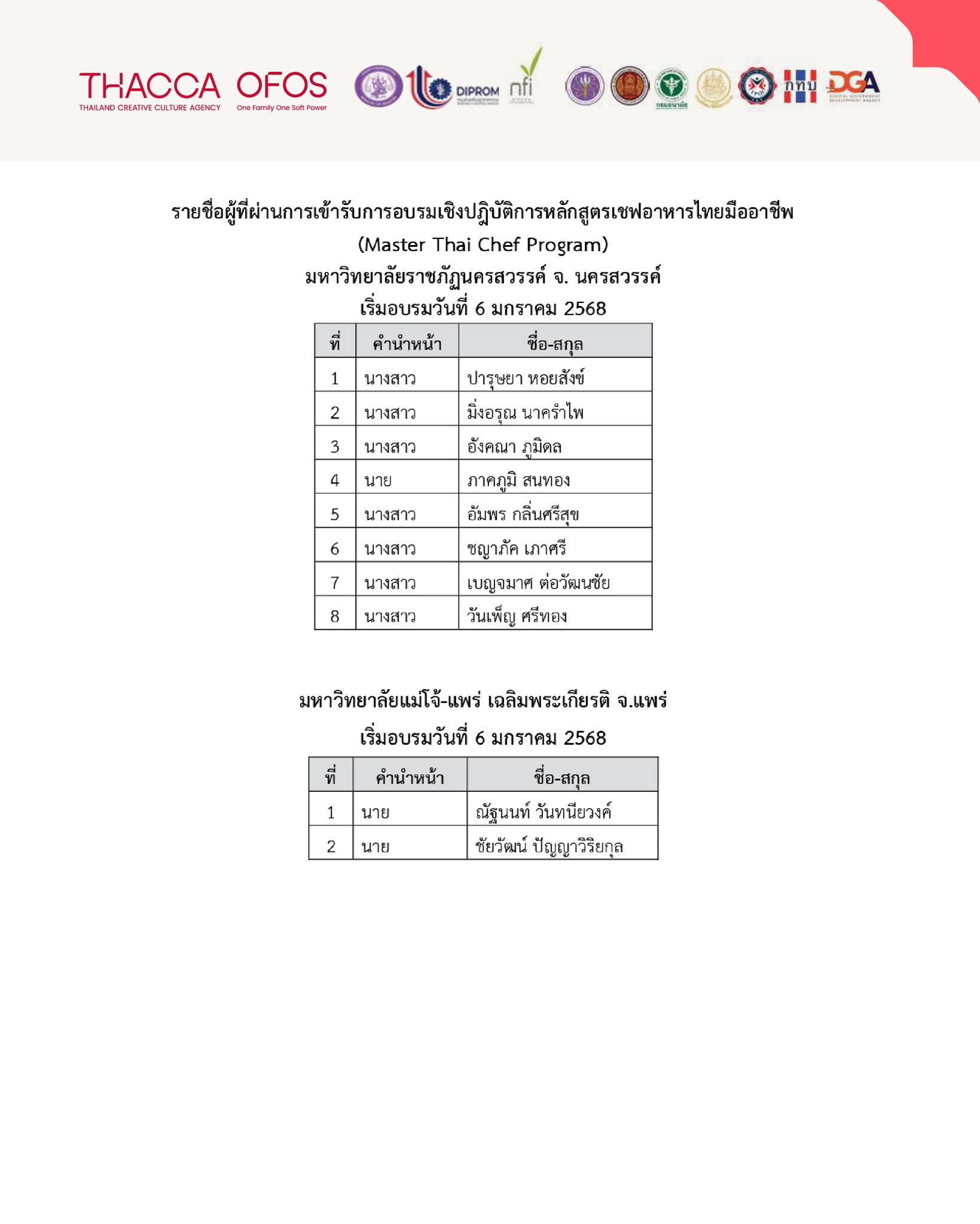 THACCA โดยคณะอนุกรรมการขับเคลื่อนอุตสาหกรรมด้านอาหาร ประกาศรายชื่อผู้ผ่านการคัดเลือกเข้าร่วมอบรมในโครงการ “หนึ่งหมู่บ้าน หนึ่งเชฟอาหารไทย” รุ่นที่ 1