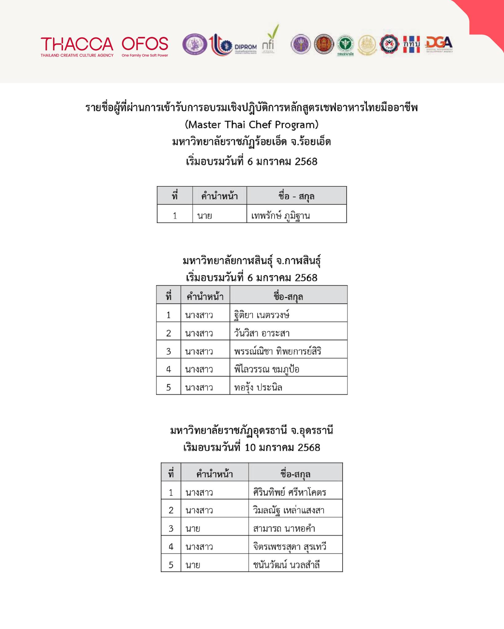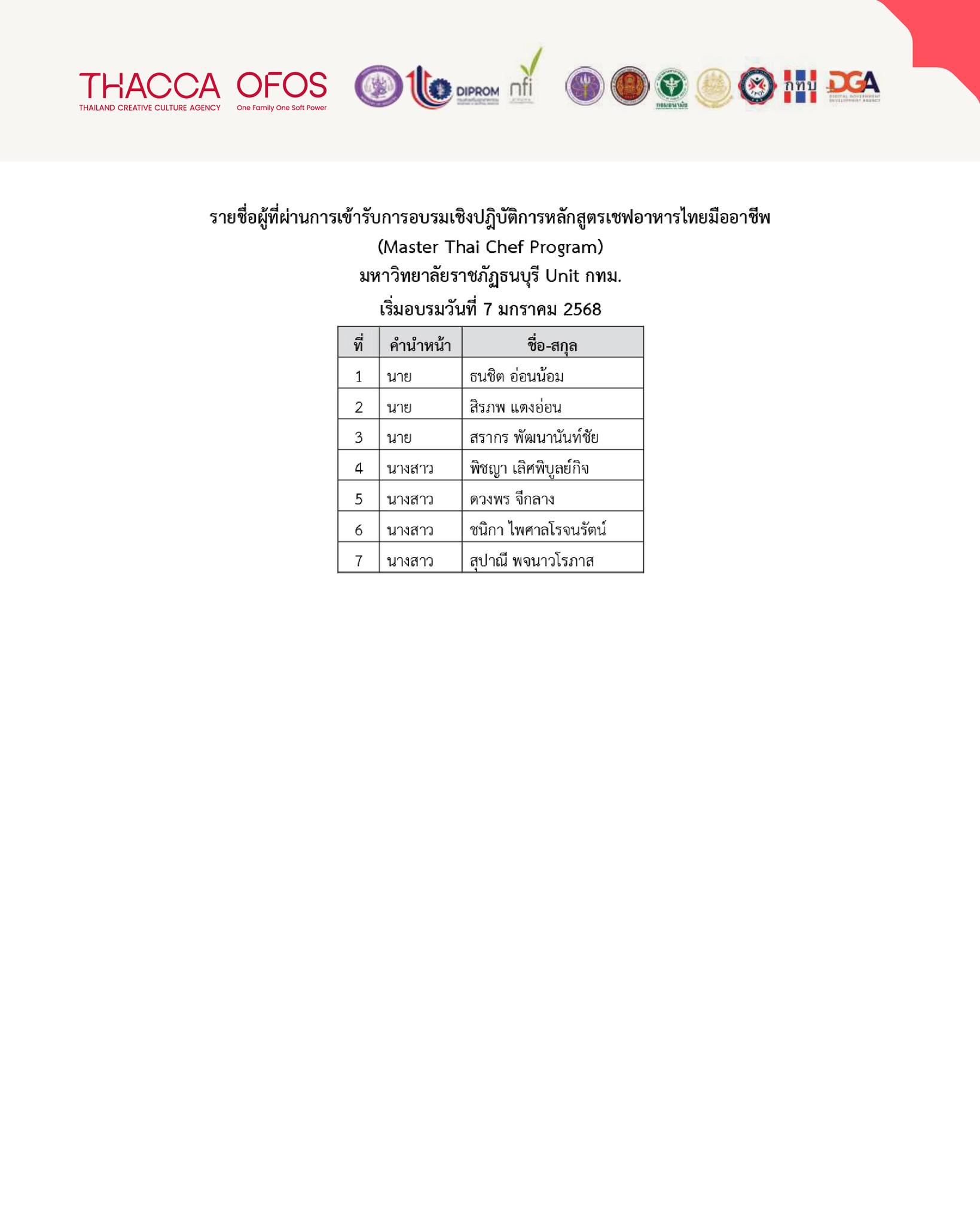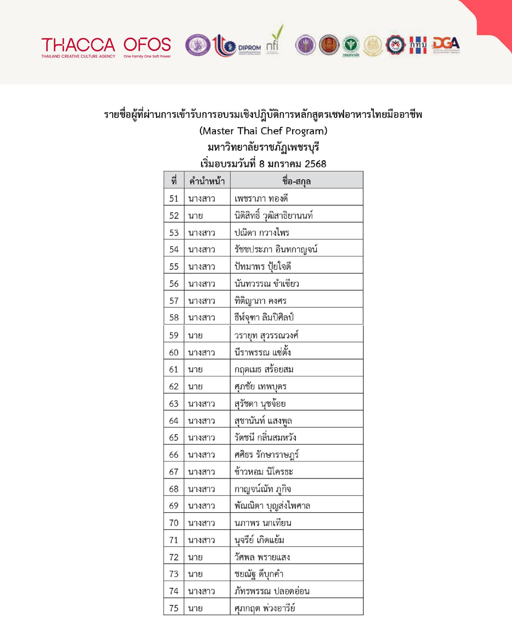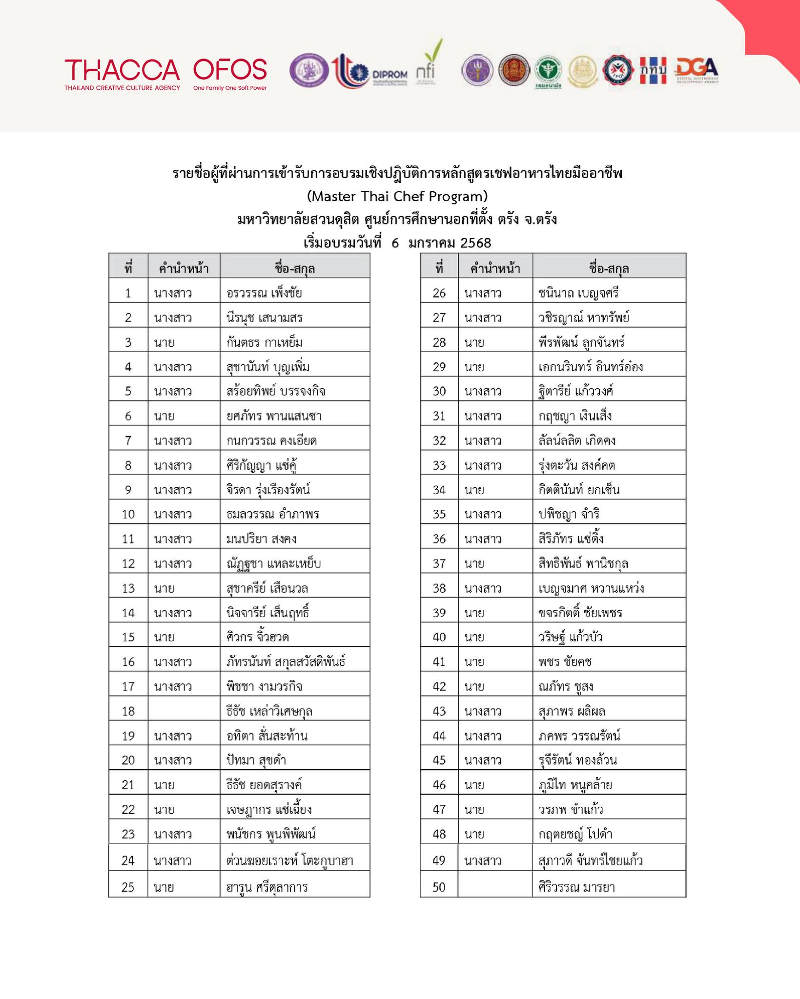 THACCA โดยคณะอนุกรรมการขับเคลื่อนอุตสาหกรรมด้านอาหาร ประกาศรายชื่อผู้ผ่านการคัดเลือกเข้าร่วมอบรมในโครงการ “หนึ่งหมู่บ้าน หนึ่งเชฟอาหารไทย” รุ่นที่ 1