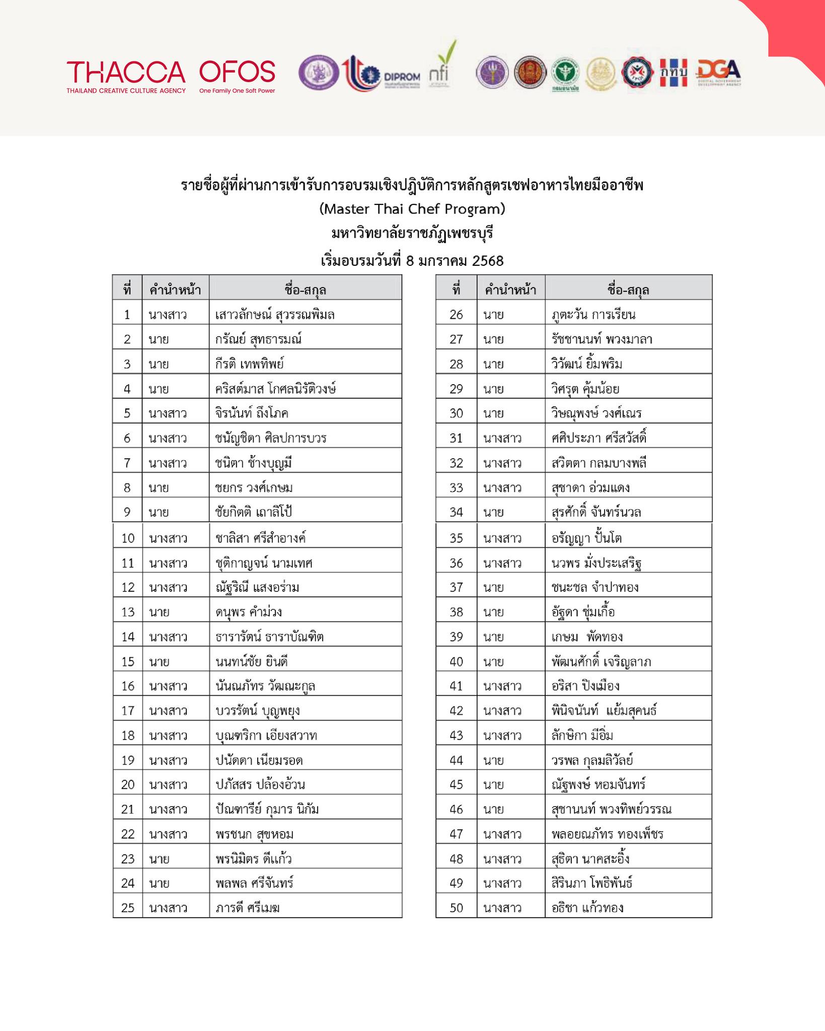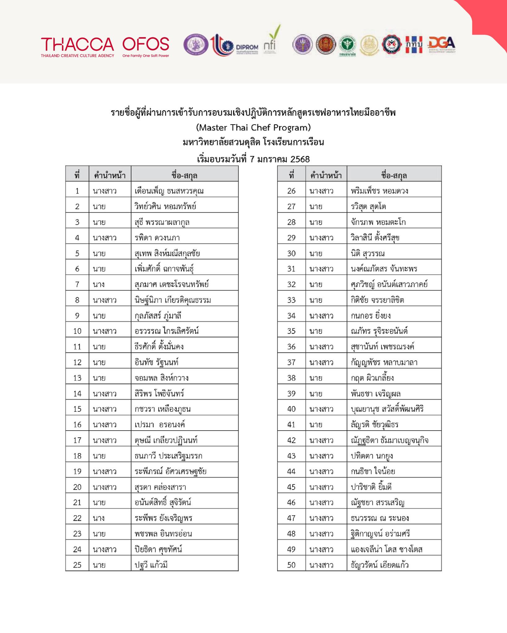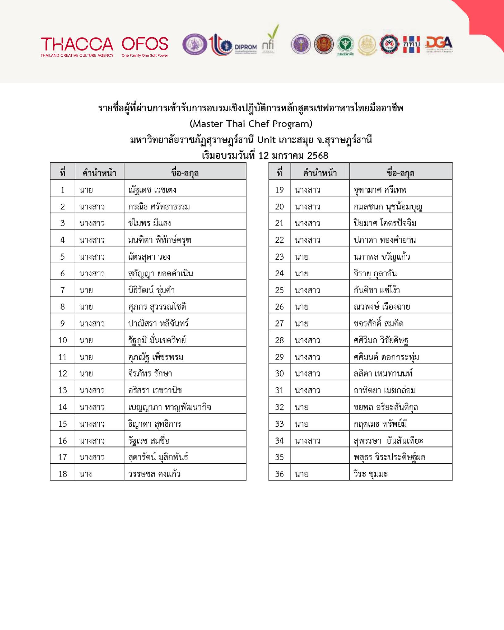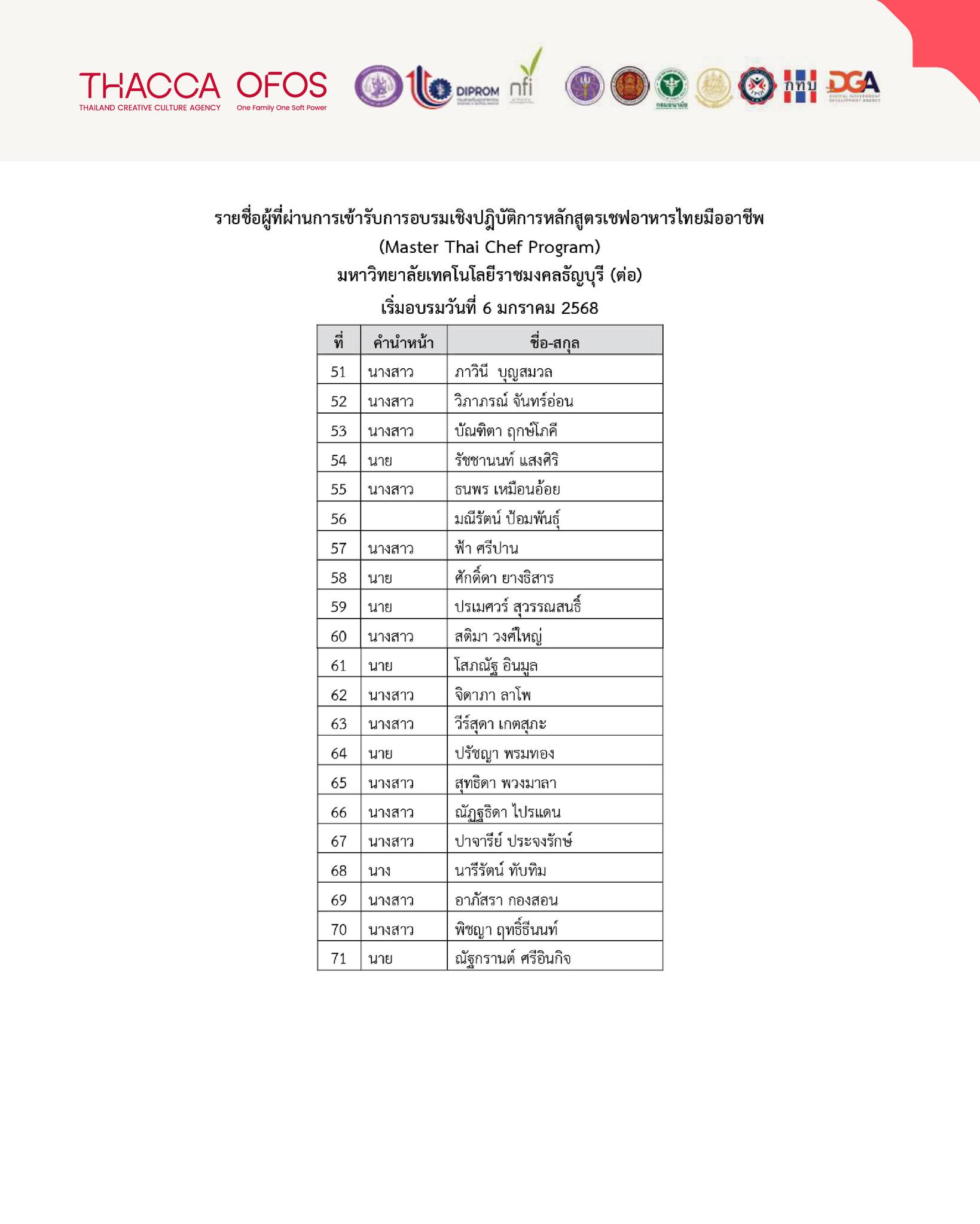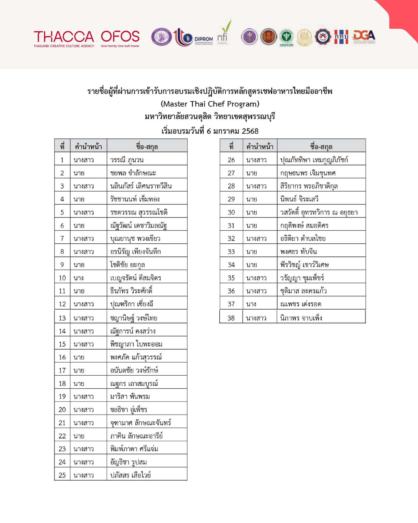 THACCA โดยคณะอนุกรรมการขับเคลื่อนอุตสาหกรรมด้านอาหาร ประกาศรายชื่อผู้ผ่านการคัดเลือกเข้าร่วมอบรมในโครงการ “หนึ่งหมู่บ้าน หนึ่งเชฟอาหารไทย” รุ่นที่ 1