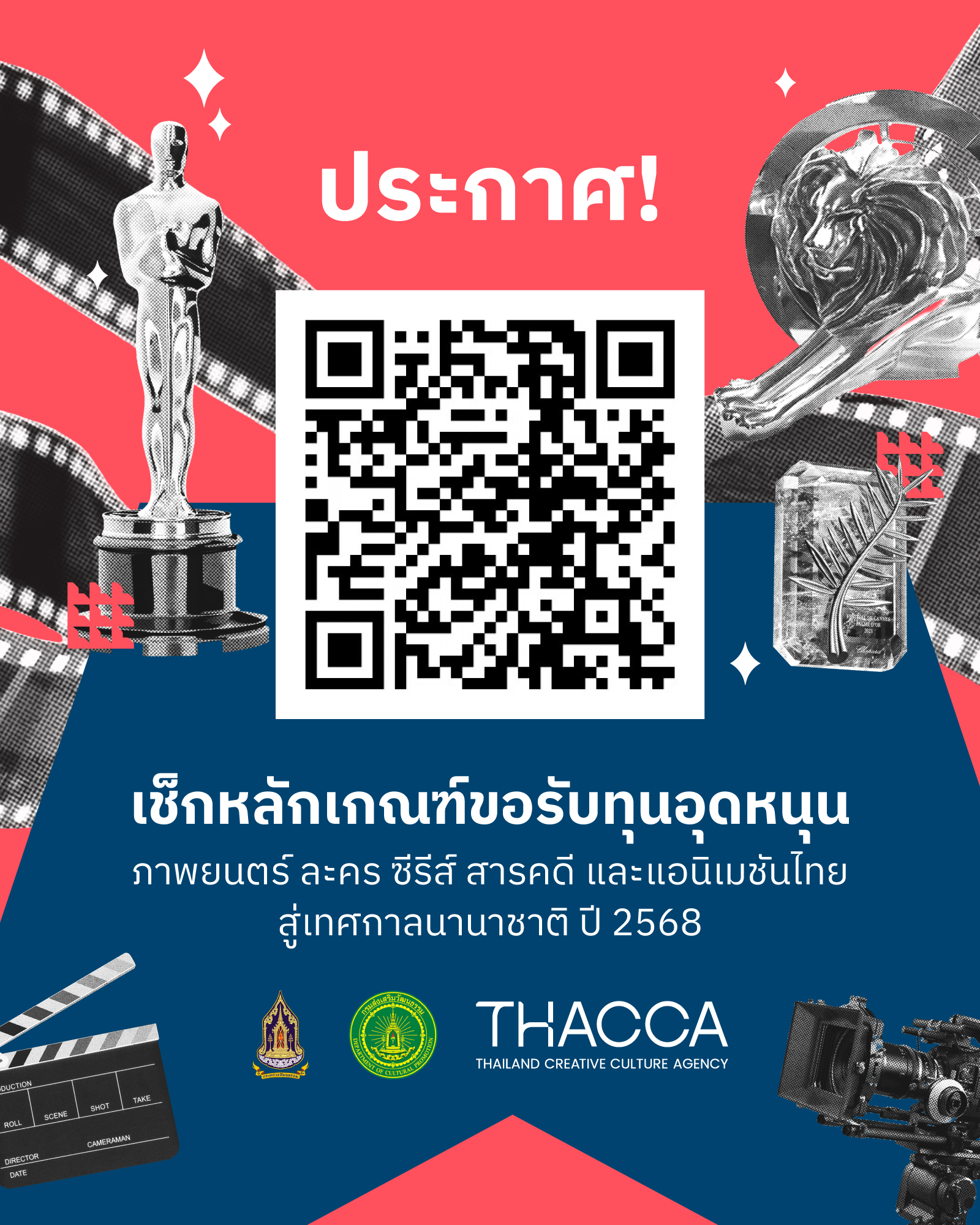 THACCA ขอเชิญชวนผู้ประกอบการและบุคลากรด้านภาพยนตร์ ละคร ซีรีส์ สารคดี และแอนิเมชันไทย ที่อยากนำผลงานของตัวเองไปฉายให้ในงานเทศกาลภาพยนตร์ระดับนานาชาติ ร่วมสมัครในโครงการ “เสริมสร้างภาพลักษณ์ความเป็นไทยสู่สากล กิจกรรมเงินอุดหนุนสนับสนุนผู้ประกอบการและบุคลากรด้านภาพยนตร์ ละคร ซีรีส์ สารคดี แอนิเมชันไทย เพื่อเข้าร่วมเทศกาลและงานประกาศรางวัลนานาชาติ ประจำปีงบประมาณ 2568”