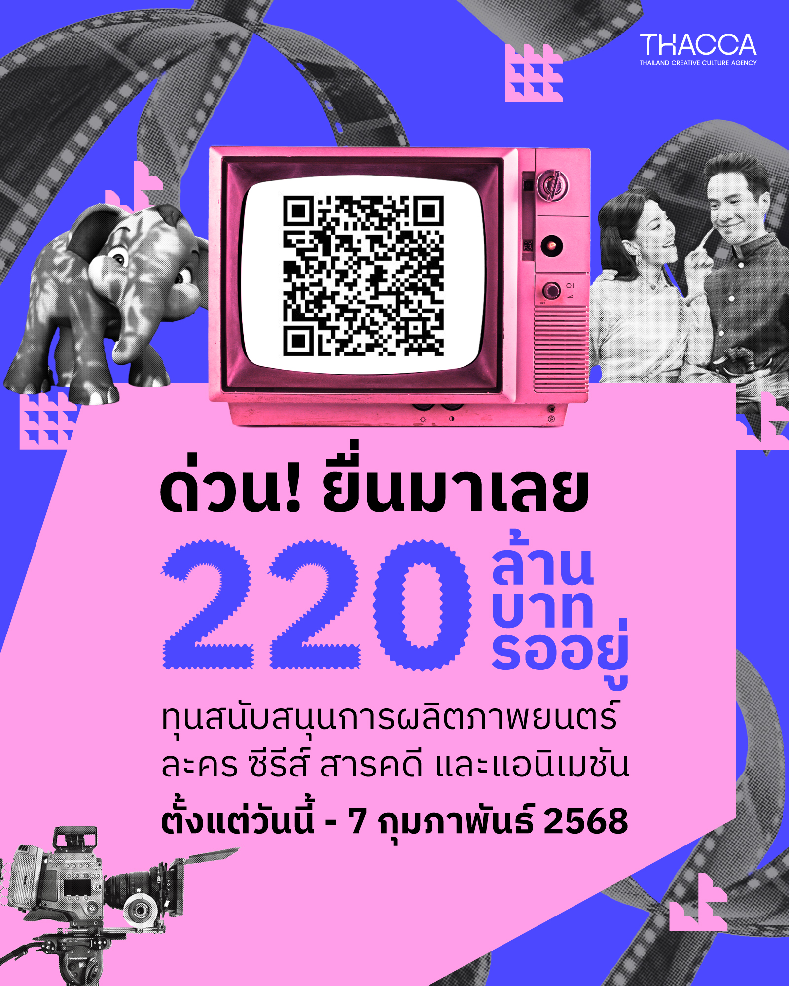 รับสมัคร ขอรับเงินอุดหนุนสนับสนุนการผลิตภาพยนตร์ ละคร ซีรีส์ สารคดี แอนิเมชันไทย 220 ล้านบาท DATE 13 ม.ค. 2025