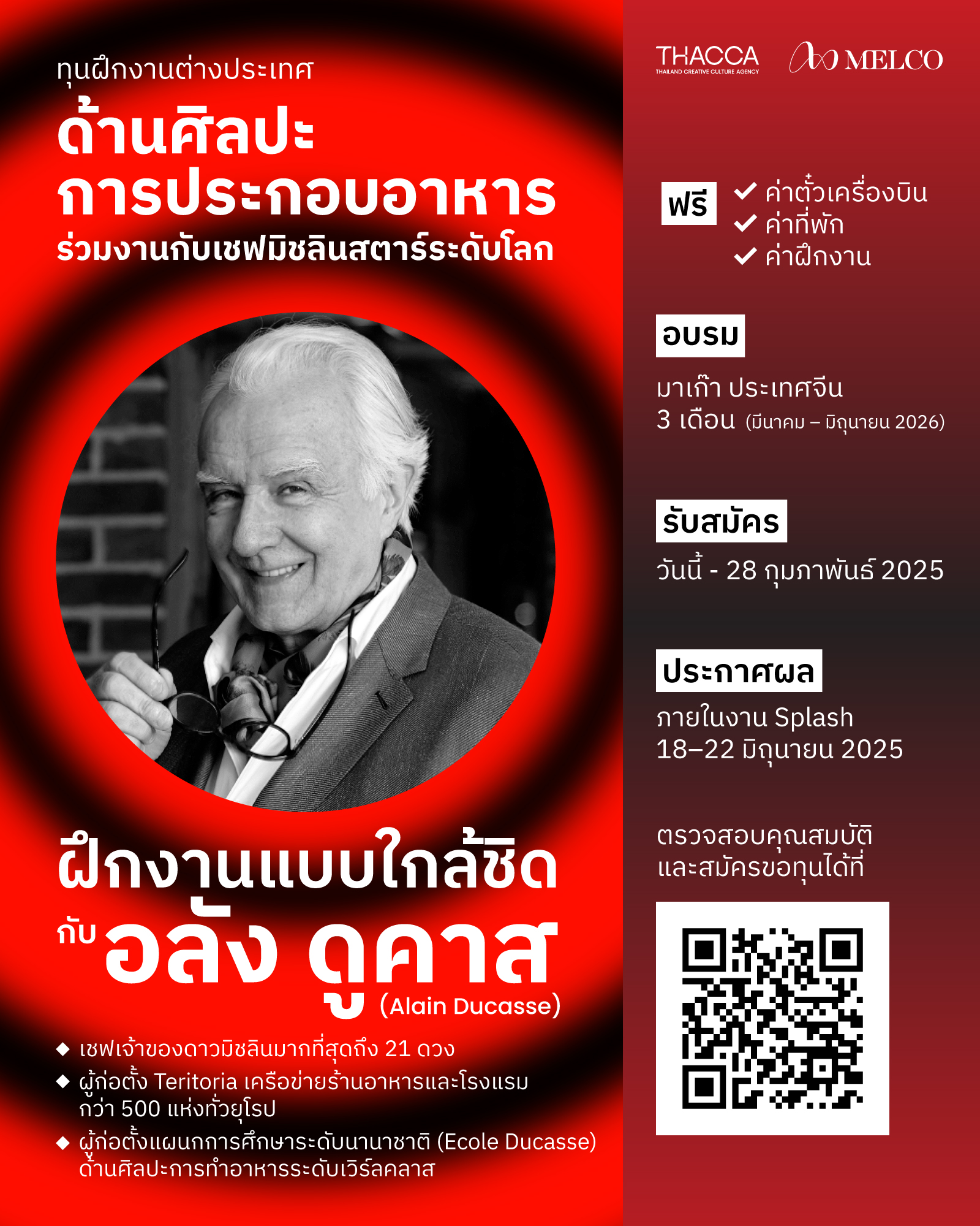 Thailand Creative Culture Agency (THACCA) ร่วมกับ Melco Resorts & Entertainment เปิดรับสมัคร “ทุนฝึกงาน THACCA x Melco Global Soft Power Academy” ใน 5 สาขาสุดฮอต! ได้แก่ ด้านศิลปะการประกอบอาหาร ด้านการออกแบบและนวัตกรรม ด้านสถาปัตยกรรมและการพัฒนาเมือง ด้านศิลปะการแสดง และด้านกลยุทธ์การสร้างแบรนด์และการพัฒนาผลิตภัณฑ์สร้างสรรค์