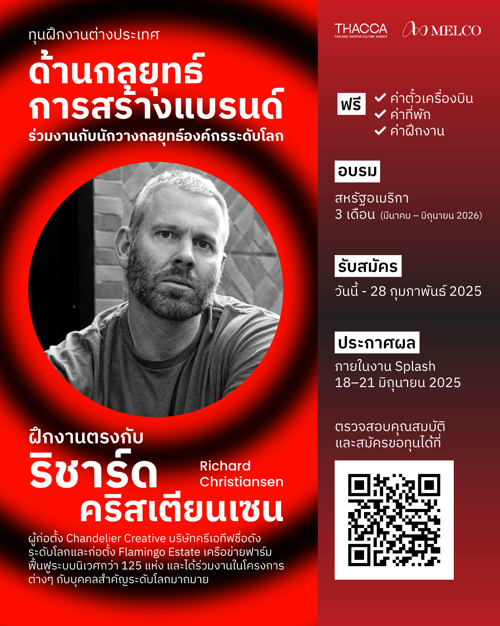 Thailand Creative Culture Agency (THACCA) ร่วมกับ Melco Resorts & Entertainment เปิดรับสมัคร “ทุนฝึกงาน THACCA x Melco Global Soft Power Academy” ใน 5 สาขาสุดฮอต! ได้แก่ ด้านศิลปะการประกอบอาหาร ด้านการออกแบบและนวัตกรรม ด้านสถาปัตยกรรมและการพัฒนาเมือง ด้านศิลปะการแสดง และด้านกลยุทธ์การสร้างแบรนด์และการพัฒนาผลิตภัณฑ์สร้างสรรค์