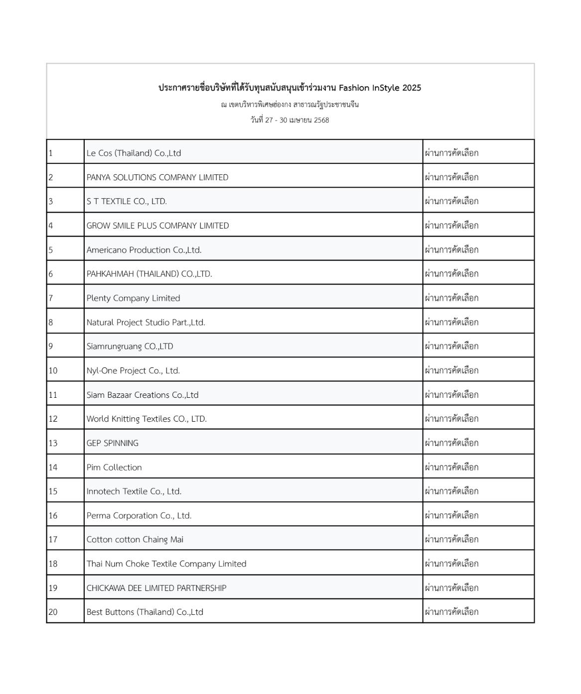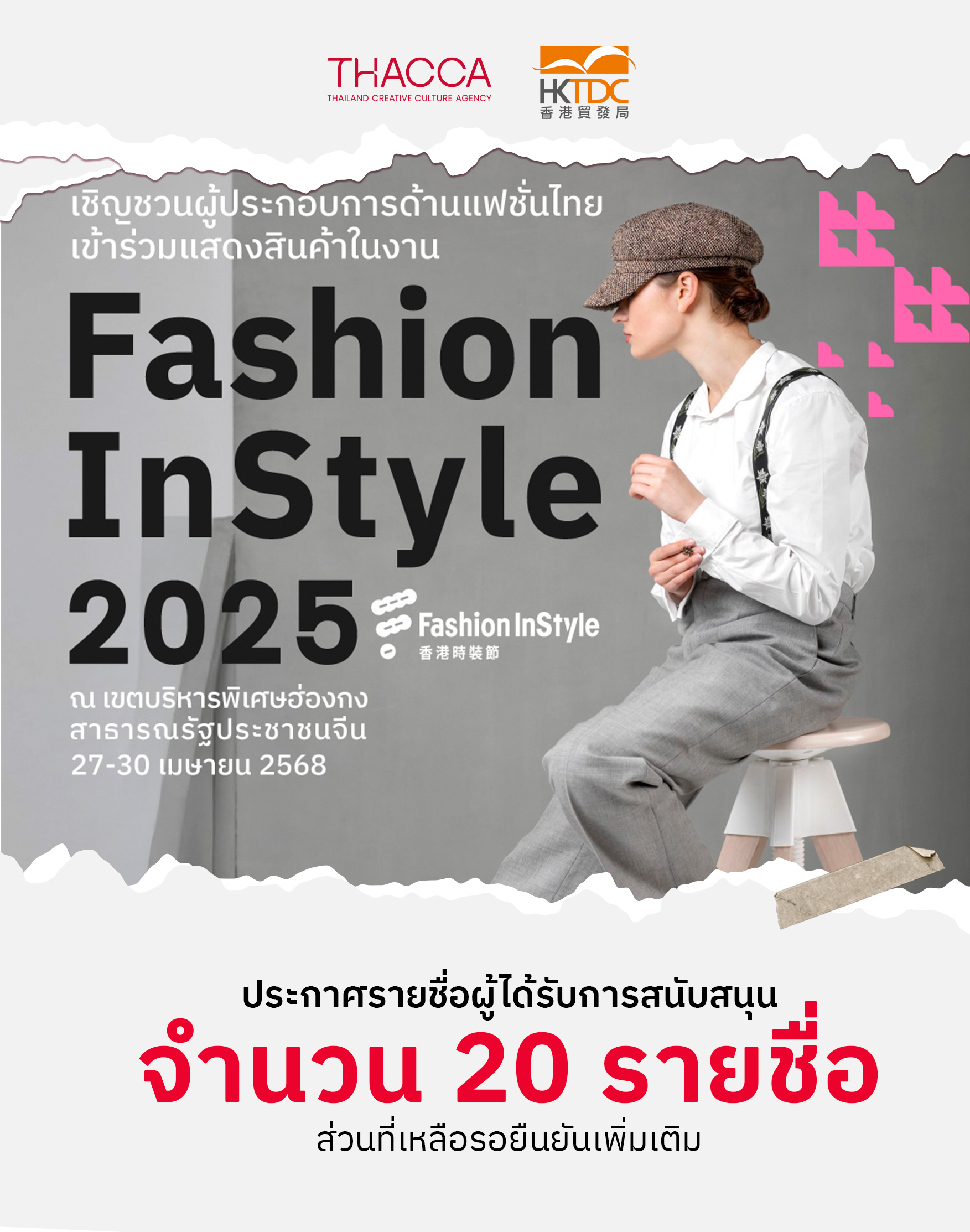 THACCA-Thailand Creative Culture Agency ของแสดงความยินดีกับ 20 บริษัท ที่ได้รับทุนสนับสนุนเข้าร่วมงาน Fashion InStyle 2025 ณ เขตบริหารพิเศษฮ่องกง สาธารณรัฐประชาชนจีน ที่จะจัดขึ้นในช่วงวันที่ 27 - 30 เมษายน 2568