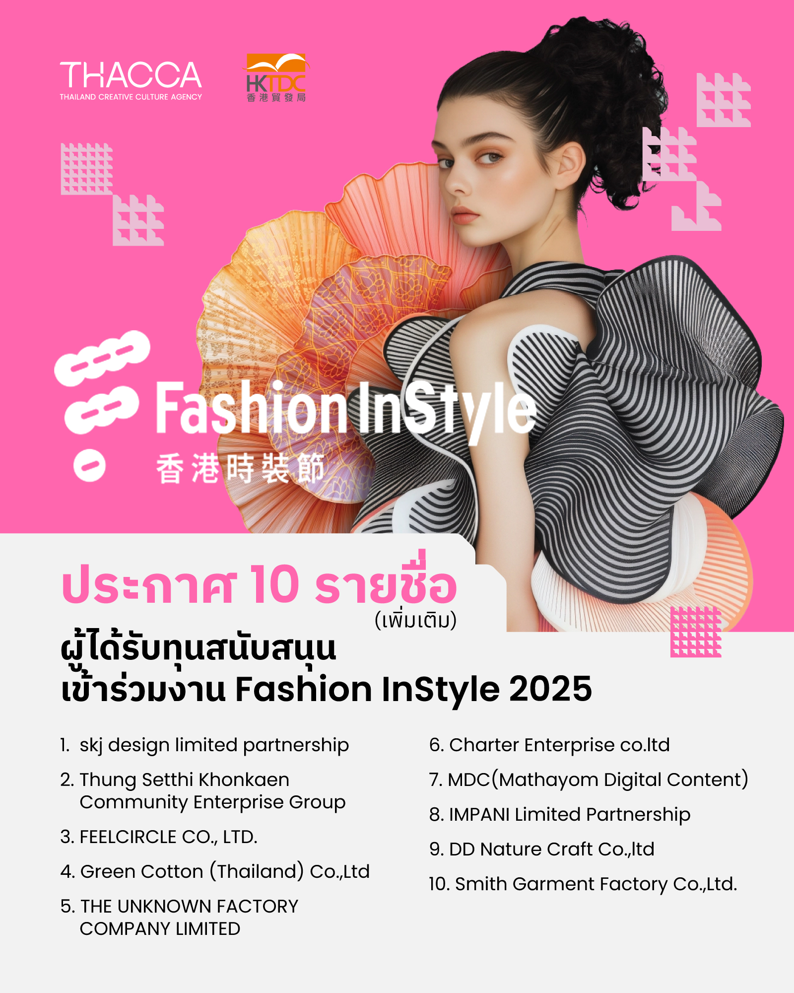 THACCA-Thailand Creative Culture Agency ขอแสดงความยินดีกับ 10 บริษัท ที่ได้รับทุนสนับสนุนเข้าร่วมงาน Fashion InStyle 2025 ณ เขตบริหารพิเศษฮ่องกง สาธารณรัฐประชาชนจีน ที่จะจัดขึ้นในช่วงวันที่ 27-30 เมษายน 2568
