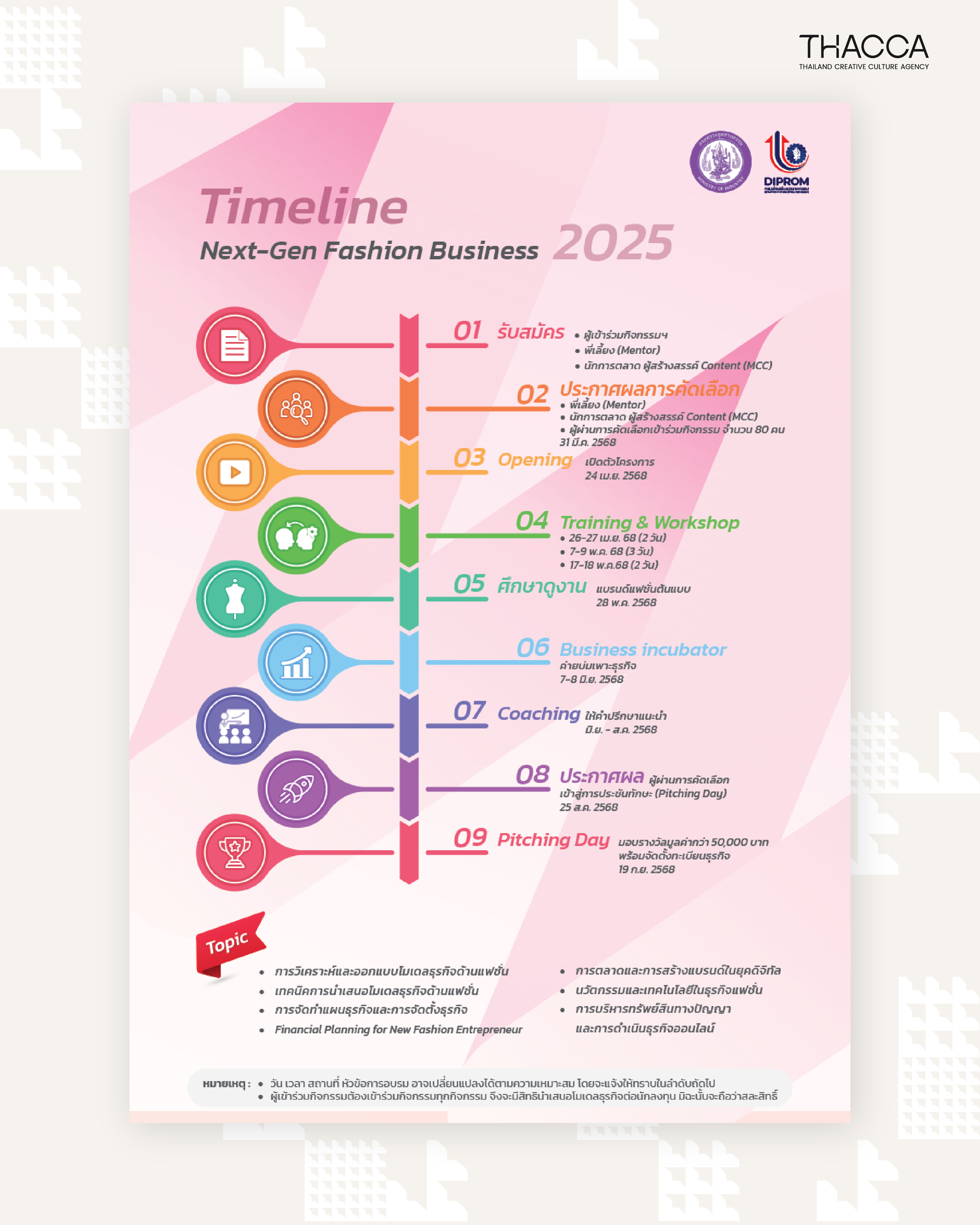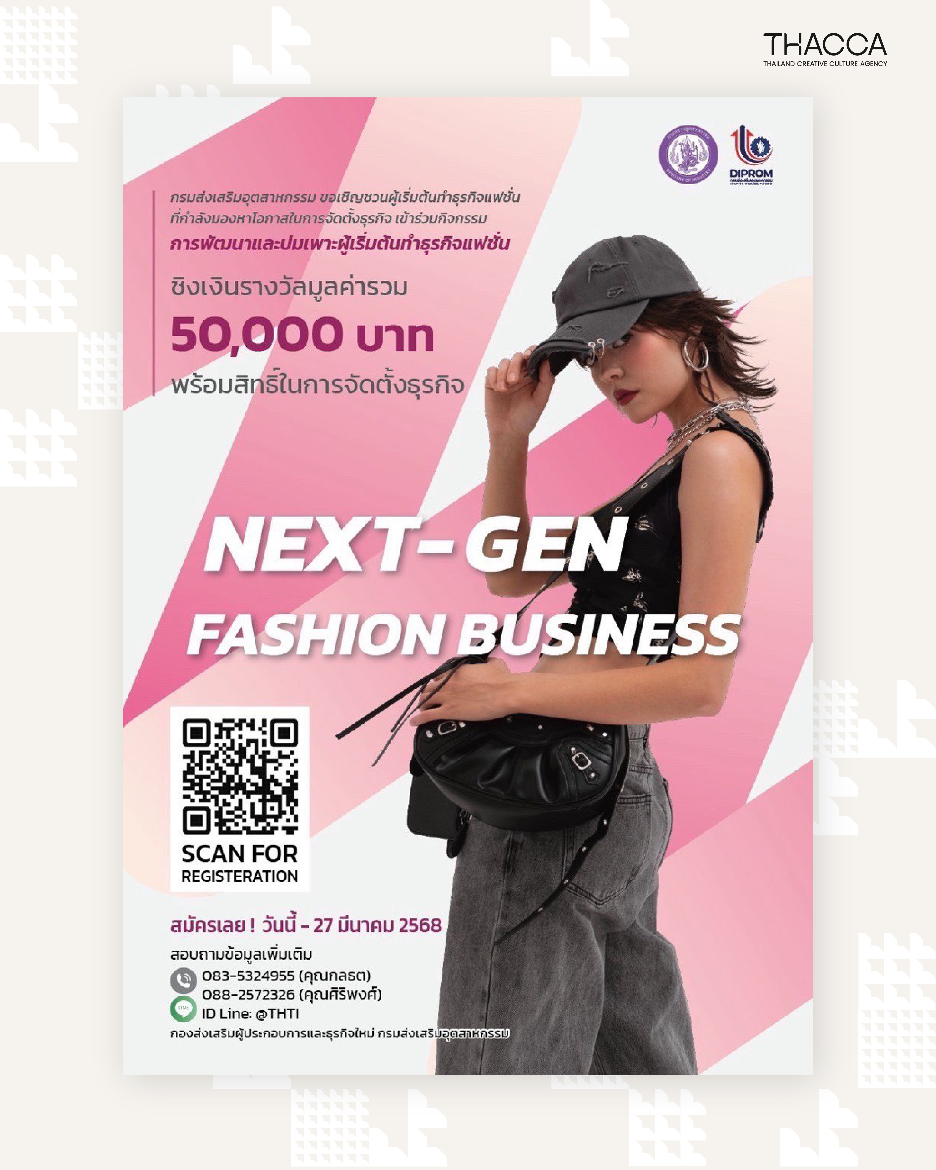 THACCA-Thailand Creative Culture Agency โดยอนุกรรมการขับเคลื่อนอุตสาหกรรมด้านแฟชั่น ร่วมกับ กรมส่งเสริมอุตสาหกรรม กระทรวงอุตสาหกรรม ขอเชิญชวนผู้ประกอบกิจการหน้าใหม่ด้านแฟชั่น เข้าร่วมกิจกรรม “Next-Gen Fashion Business เพื่อพัฒนาและบ่มเพาะผู้เริ่มต้นทำธุรกิจแฟชั่น” ภายใต้โครงการพัฒนาและเชื่อมโยงเครือข่ายบุคลากรอุตสาหกรรมแฟชั่น (Fashion Alliance) ประจำปีงบประมาณ 2568